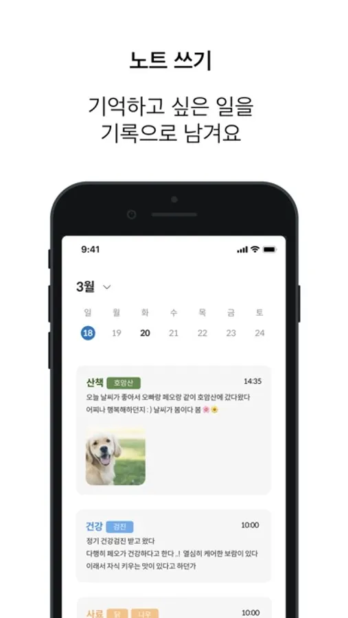 - 기억하고 싶은 일을 노트로 기록해요. 텍스트와 사진 모두 담을 수 있어요