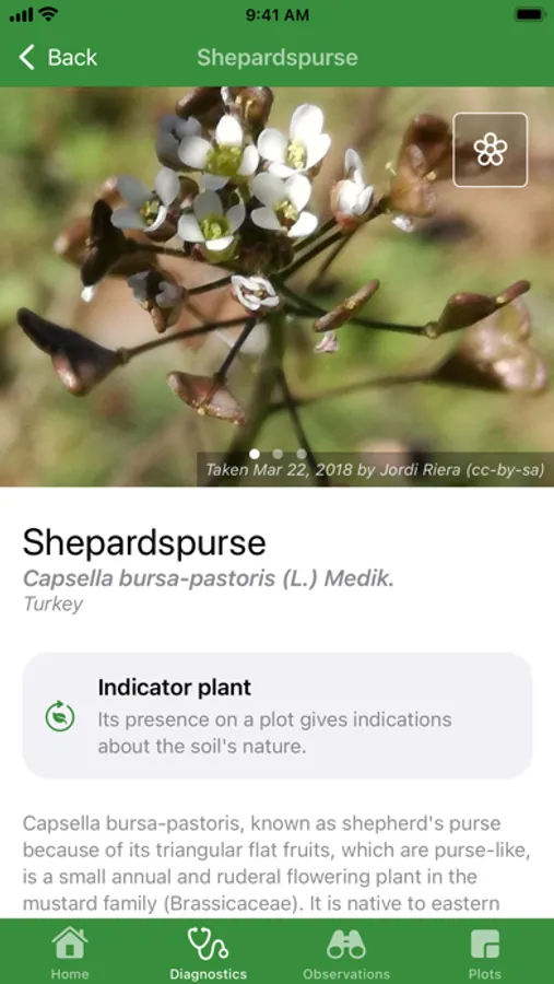 By taking a simple photo and thanks to PlantNet database, Soildiag identifies your plant and gives you some additional informations about it (photos, description, taxonomy, scientific names, common names, synonyms, links to external databases, etc.). Soildiag also gives you the bioindication characteristics of the recognized plants.