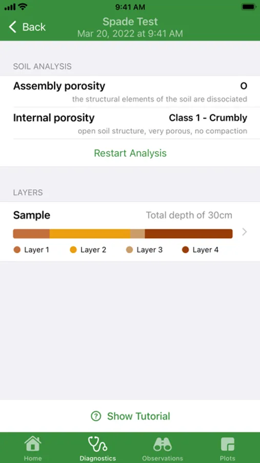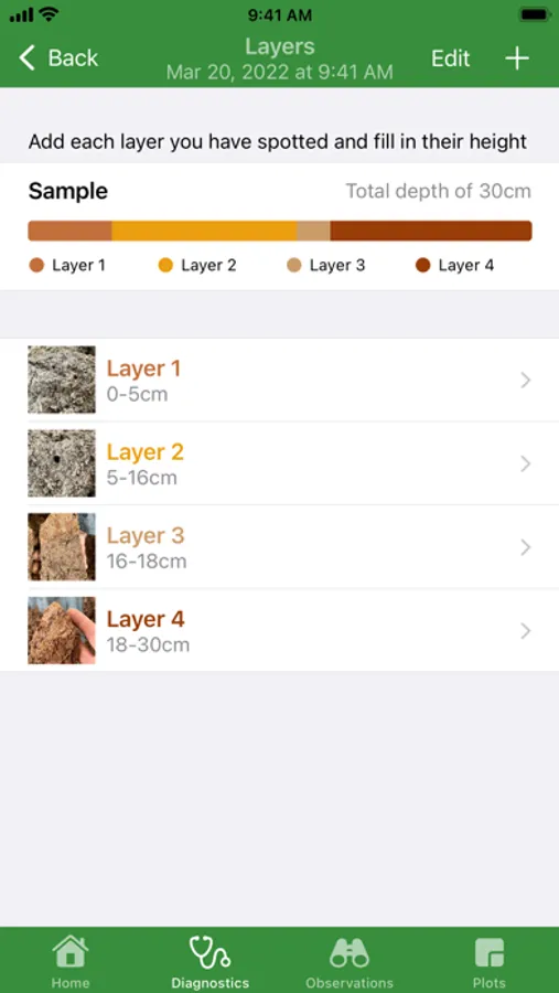 After extracting a block of soil with a simple spade, follow the notation guide included in the application to define a classification of the assembly porosity of your clods as well as their internal porosity. Then, record the different layers in order to document their evolution over time.