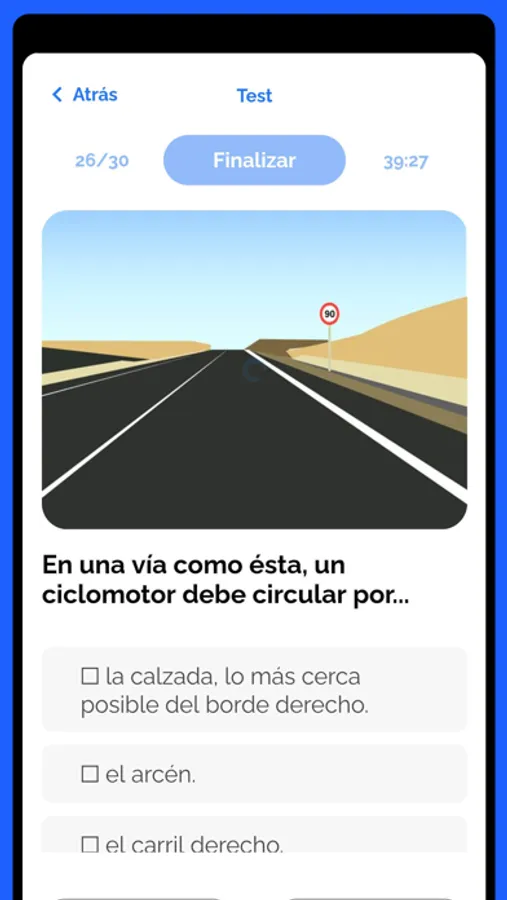 2) Simulación de examen: imagínate que estás delante del examen teórico oficial y que tienes un tiempo limitado para contestar a todas las preguntas del Test DGT. ¡Más que imaginarlo, ahora lo podrás hacer en la aplicación!