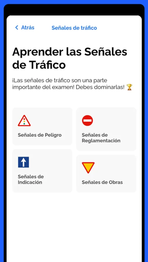 3) Señales de tráfico: demuestra que puedes sacarte el carné de conducir fácilmente y que no se te escapa ninguna señal de tráfico, ¡ni incluso la más raras! Nuestra app te ayudará a aprender todas las señales de tráfico que necesitas conocer para conseguir el permiso B.