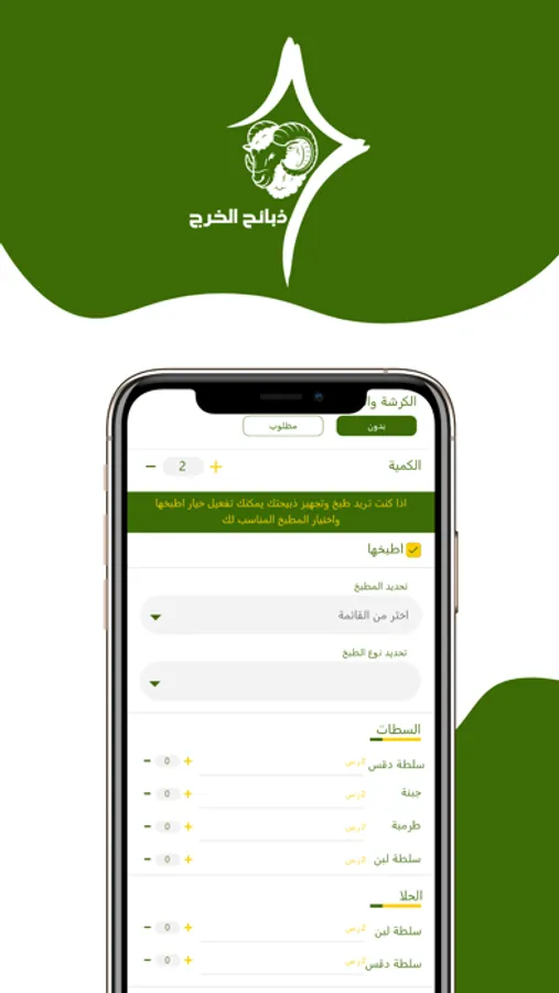 هو تطبيق وسيط بين المستخدمين واداره التطبيق مباشرة ، حيث يقوم المستخدمين بتحديد الطلبات اللتى يريدونها من الذبائح وتحديد الكمية والتفاصيل المطلوبه، ثم يقوم المستخدم بادخال البيانات الخاصه به وتحديد طريقة الدفع وارسال الطلب الى الاداره ، الى ان يتم الموافقه علي الطلب وانهاءه عن طريق لوحة التحكم الخاصة بالتطبيق.