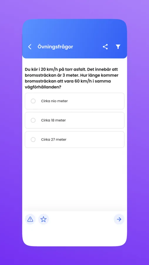 Appen innehåller många frågor avseende olika ämnen. Frågorna ställs i slumpmässig ordning för att du ska kunna lära dig så snabbt och effektivt som möjligt.