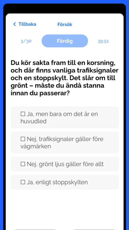 Applikationen är utrustad med en nedräkningstimer, vilken du kan använda för att förbereda dig inför Trafikverkets riktiga teoriprov.