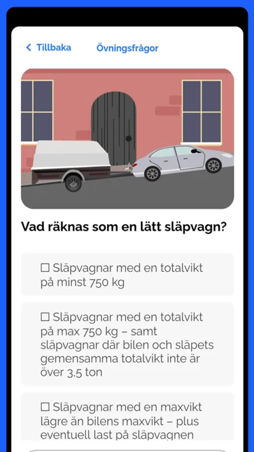 Applikationen innehåller många frågor angående flera olika ämnen, vilka hjälper dig att öva inför körprovet. Övningsfrågorna, vilka har blivit granskade av trafiklärare och experter och ställs alltid i slumpmässig ordning, gör att du lär dig så snabbt och enkelt som möjligt.