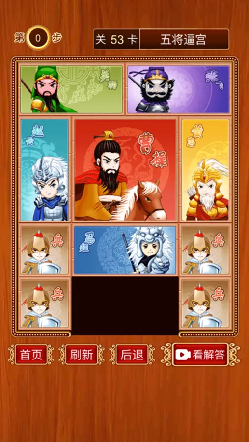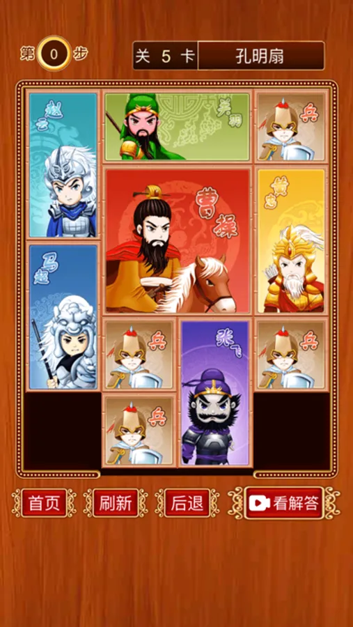 曹操被困华容道,发挥你的聪明才智挪动卡牌助曹操从正下方逃脱。