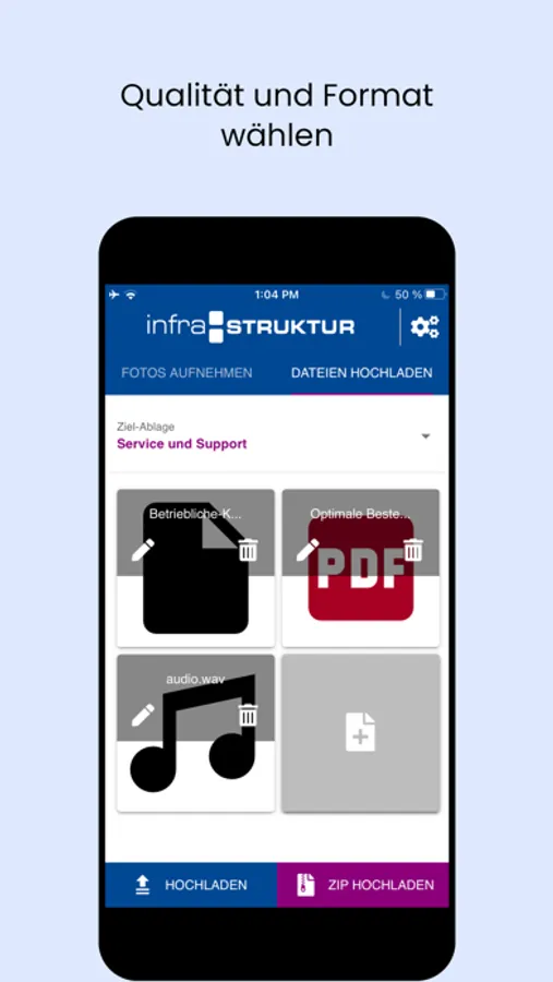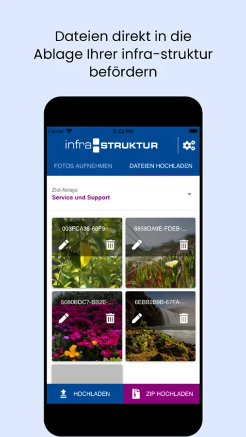 Dateien ohne Umwege vom Mobilgerät direkt in die Dokumentenablage Ihrer infra-struktur befördern - die infraUpload-App macht's möglich! — Egal ob Fotos, PDFs oder sonstige Formate - mit ein paar Klicks liegen die Daten auf Abruf in Ihrer infra-struktur bereit.