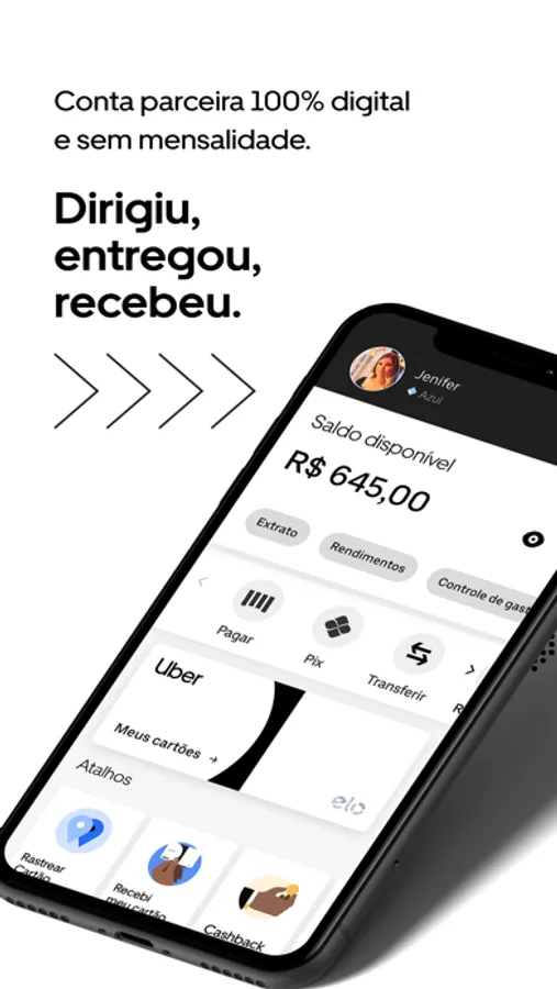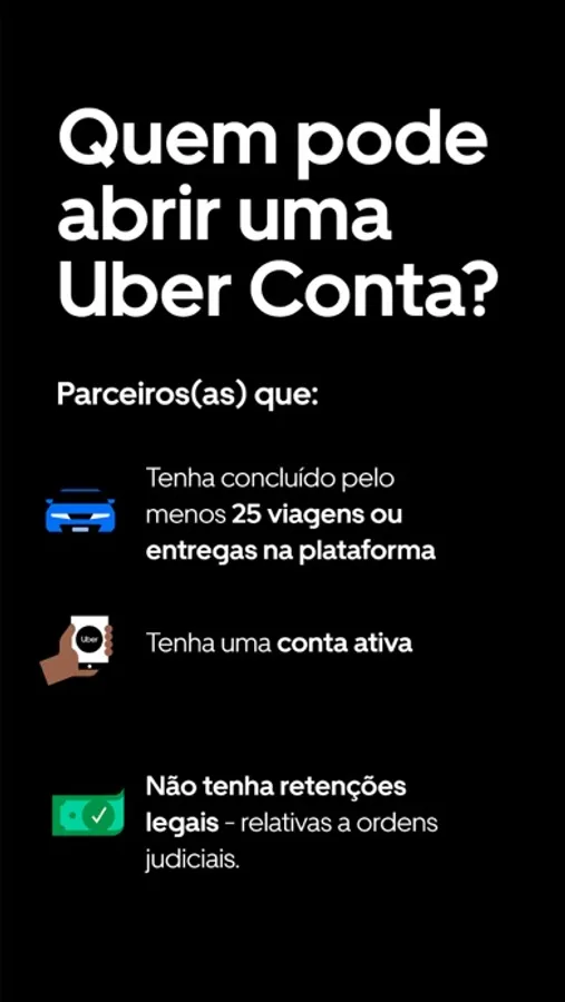 Com a Uber Conta você tem uma conta digital parceira em que você pode fazer transações em diversos estabelecimentos físicos e virtuais utilizando o Cartão Uber, sacar em caixas eletrônicos da rede Banco24Horas com QR Code, pagar boletos com tranquilidade pelo celular e fazer transferências instantâneas sem restrições de dia e hora para qualquer banco.