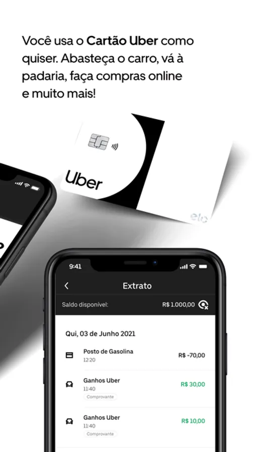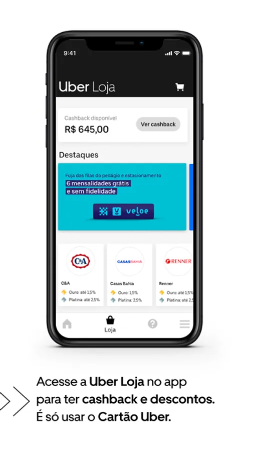 Faça compras com seu Cartão Uber nas lojas parceiras dentro do app, você aproveita cupons de desconto ou pode receber parte do dinheiro de volta com resgate direto no seu saldo. Quanto melhor for seu nível no Uber Pro, maior será sua porcentagem em dinheiro de volta.