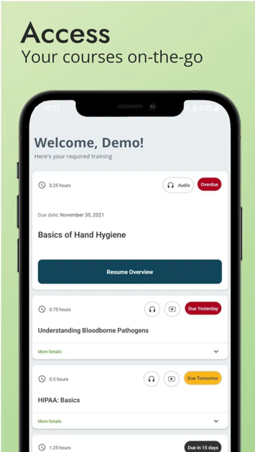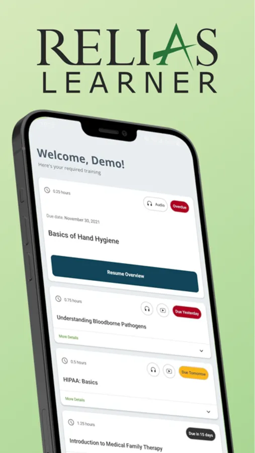 By syncing with the Relias Platform, the app allows you to pick up where you left off or begin from the start using your phone or tablet. The app contains a modern design that’s easy to use, which helps you focus on what’s important – the content.