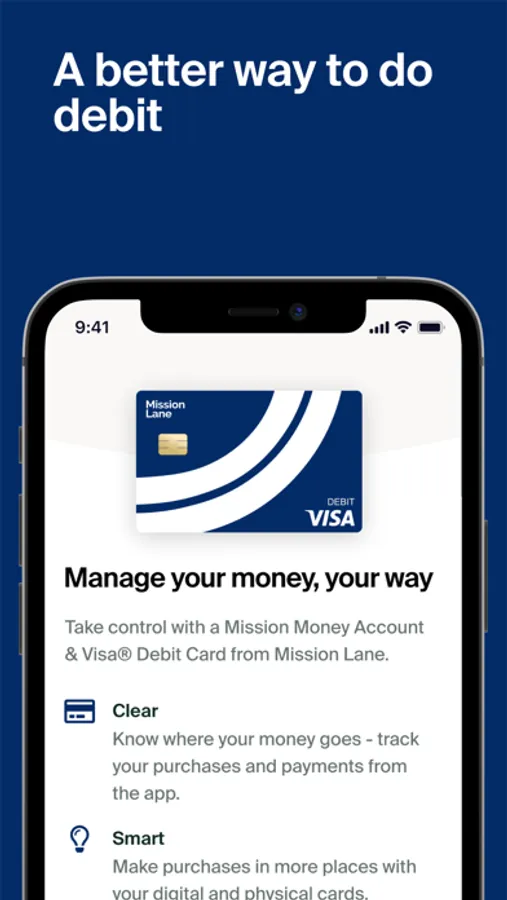 ©2023 Mission Lane LLC. All Rights Reserved. The Mission Money Visa® Debit Card is issued by Sutton Bank, Member FDIC, pursuant to a license from Visa U.S.A. Inc.