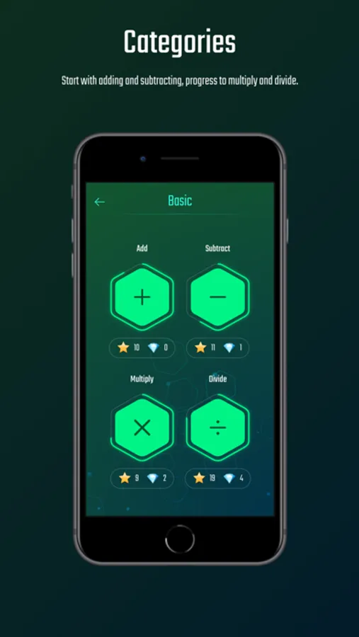 Mathed presents challenges using 4 levels of difficulty. Basic, Advanced, Hard and Expert. Each level has 4 categories which are Add, Subtract, Divide and Multiply.