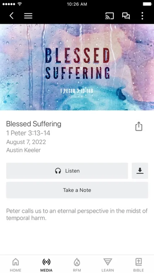 This app will help you stay connected with the day-to-day life of our church. With this app you can: watch or listen to past messages; stay up to date with push notifications; share your favorite messages via Twitter, Facebook, or email; and download messages for offline listening.