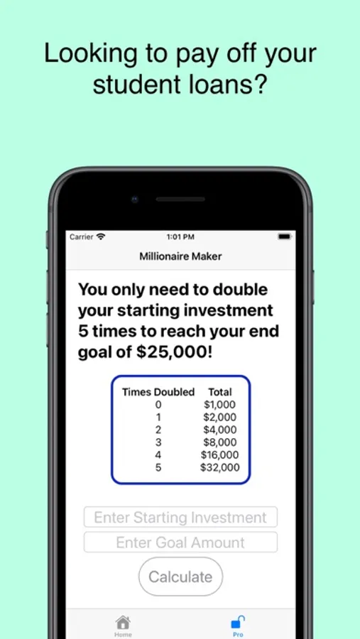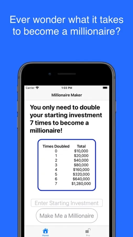 For those with custom goals, the Pro Version of the app, MX2 Pro, allows users to enter a starting investment amount as well as a custom goal amount. The app will show the user how many times the initial amount must be doubled to reach the custom goal amount. Additionally, all ads will be removed with the Pro Version.