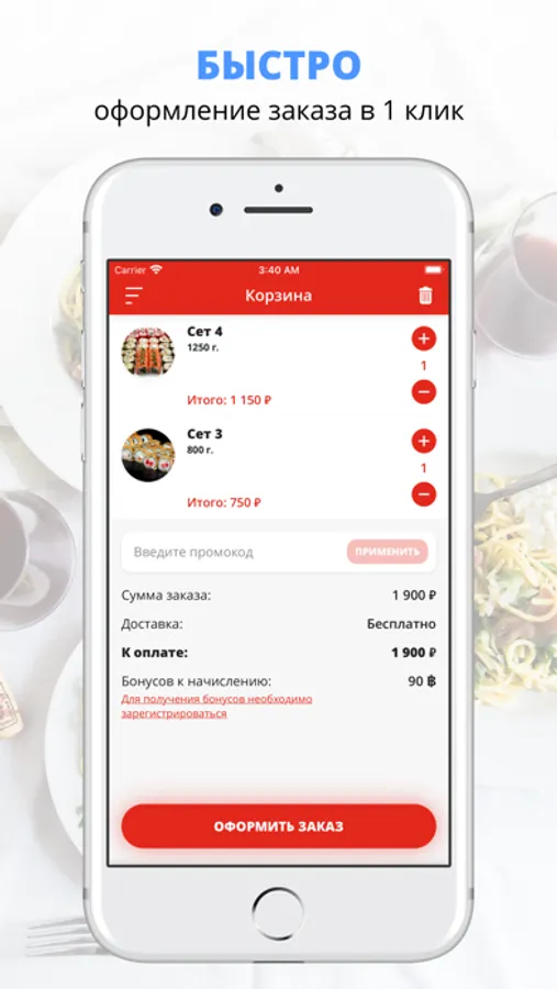 Скачивайте наше приложение, оформляйте заказ и наслаждайтесь любимой едой, где бы Вы ни были! Приятного аппетита!