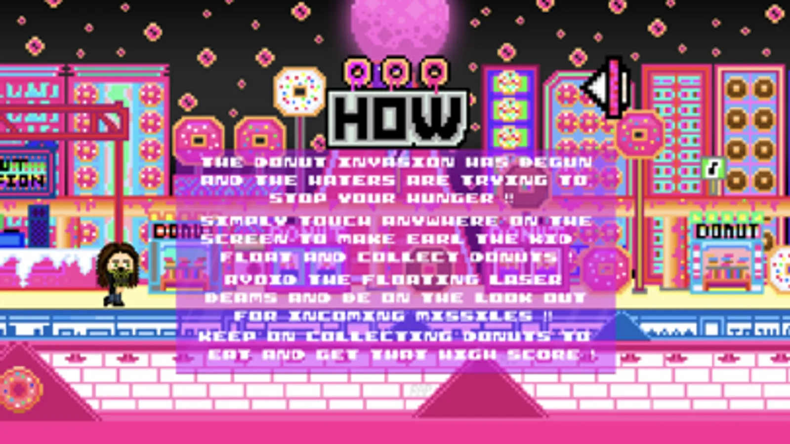 Simply touch anywhere on the screen to make Earl the Kid float along and collect Donuts to increase your high score. Avoid floating laser beams and watch for incoming missiles. Use your high score to unlock additional music.
