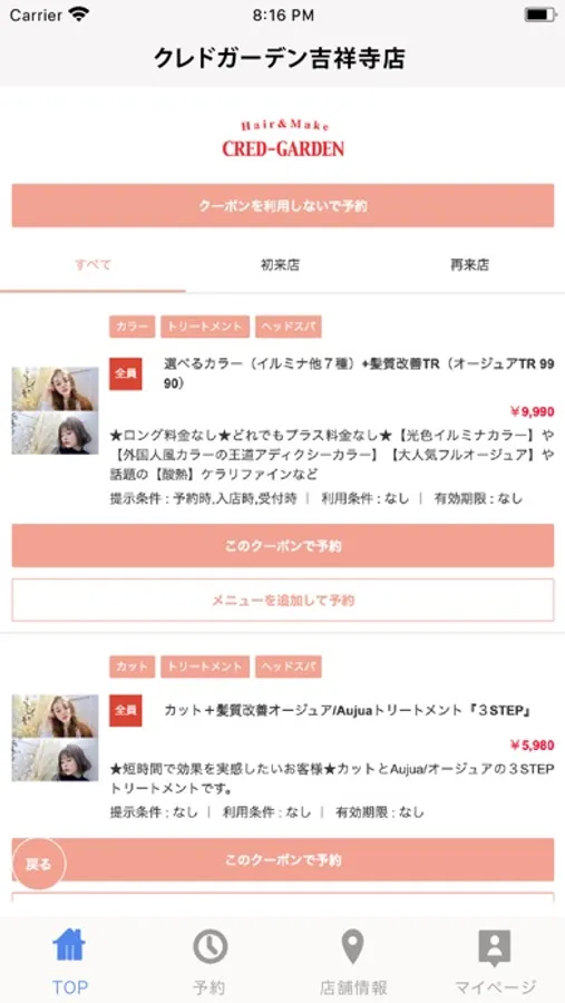 お得なクーポンが配信されます。ネット予約時にクーポン利用での予約も可能なので来店時もスムーズに施術頂けます。