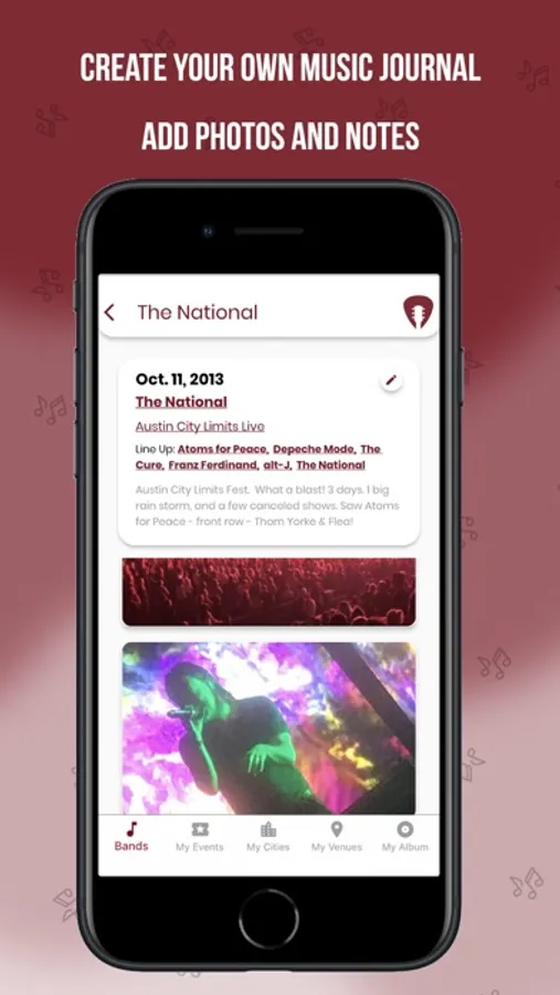 Create your personalized concert journal and diary with your complete history of bands, notes, photos and videos.