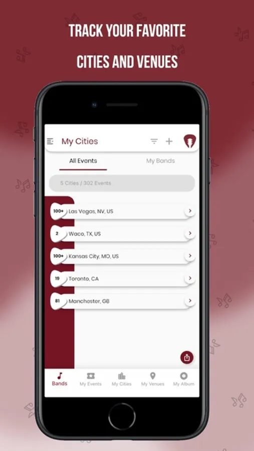 - Create your favorite city list. Instantly see which of your favorite bands are playing in any city, by date and by the map.