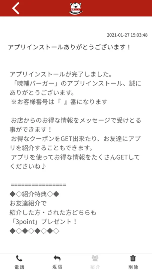 暁輔バーガーのアプリをSNSを通じてお友達に紹介する事ができます。
