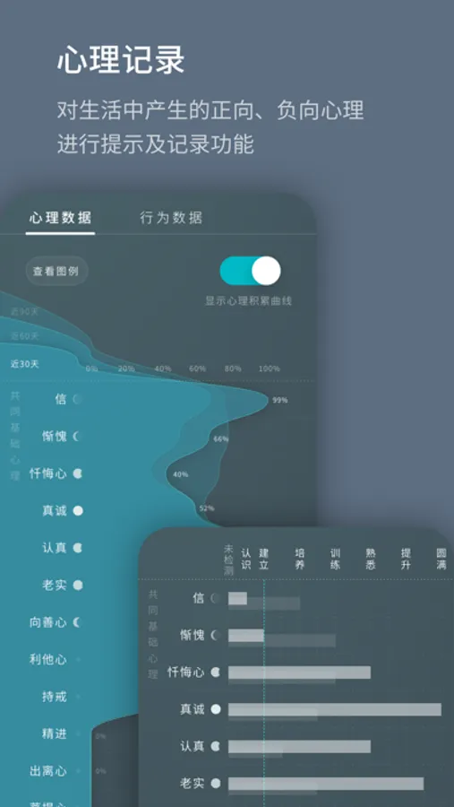 -心理记录:对生活中产生的正向、负向心理进行提示及记录功能;