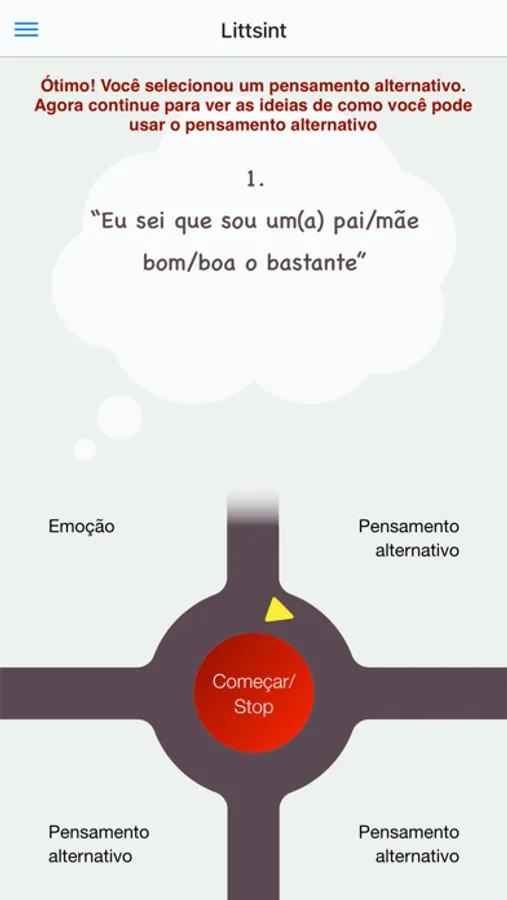 O aplicativo mostra uma série de pensamentos negativos mais comuns que as pessoas têm logo antes de ficarem com raiva, assim como os pensamentos alternativos mais comuns que podem ajudar a lidar com a raiva. Esses pensamentos foram identificados através das sessões com 800 pais que pediram ajuda para melhorar a forma como lidam com a raiva. Se você não identificar seus próprios pensamentos em Littsint, é possível escrever tanto seus pensamentos negativos quanto alternativos.