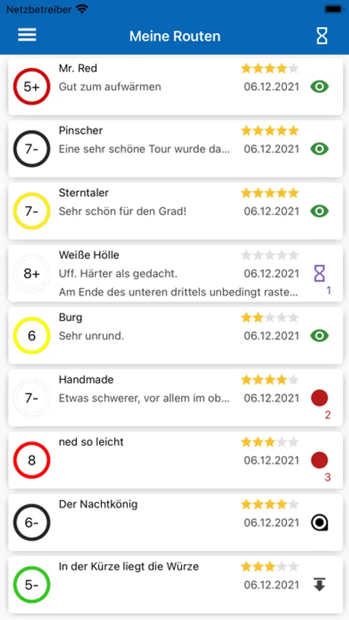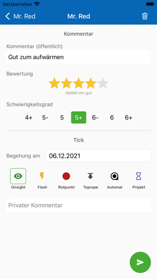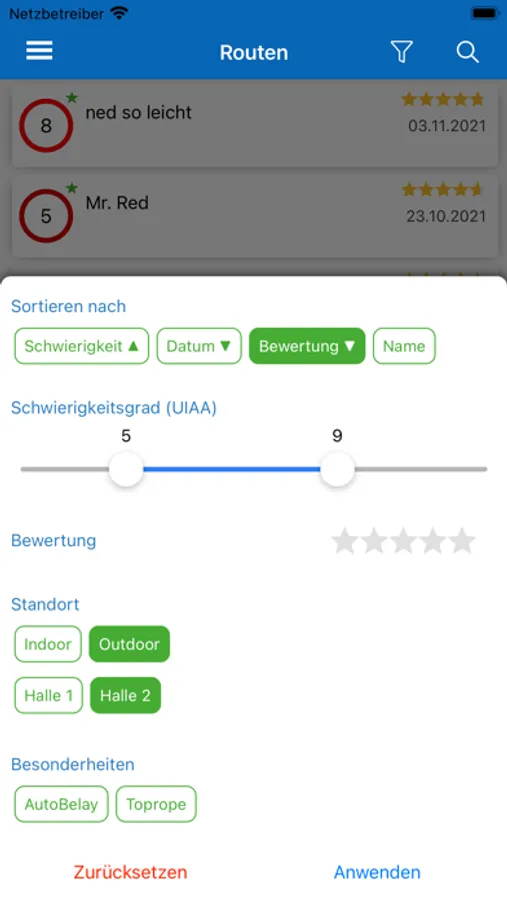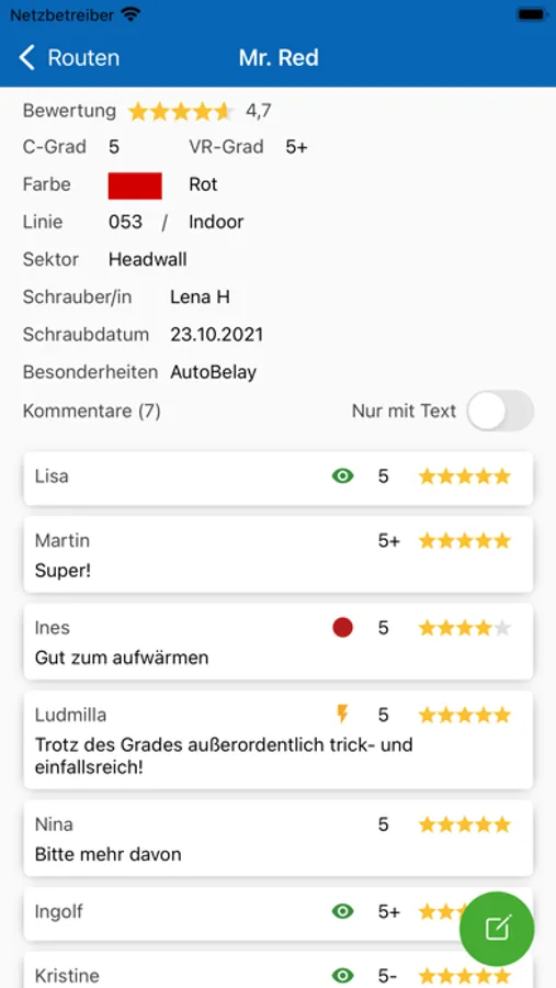 Ihr könnt Routen nach Schwierigkeitsgrad und Schönheit bewerten, eigene Kommentare abgeben und die Kommentare anderer Nutzer vor dem Einstieg lesen. Darüber hinaus könnt ihr eure persönliche Tickliste pflegen um eure Projekte im Auge zu behalten oder noch nicht gekletterte Routen in der Halle zu finden.