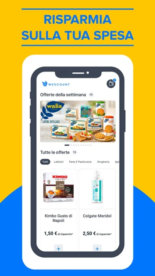 WeScount ti offre la possibilità di avere subito offerte che puoi utilizzare ovunque, al tuo supermercato di fiducia (Conad, Coop, Carrefour, Esselunga, Bennet, Acqua&Sapone, ecc.) o per tutti i tuoi acquisti online. Scopri ogni settimana nuovi sconti sui tuoi brand preferiti e richiedi il tuo rimborso per poter iniziare da subito a risparmiare ancora di più sui tuoi acquisti.