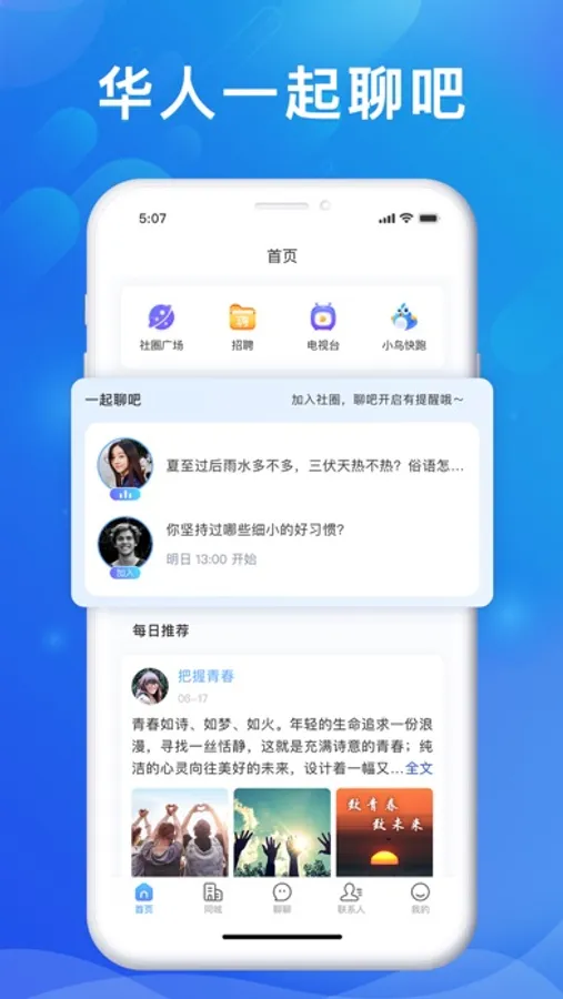 海外寻乡、同城交友。与同在海外的华人小伙伴们一起聊聊吧,支持文字、图片、表情、位置、实时音视频。