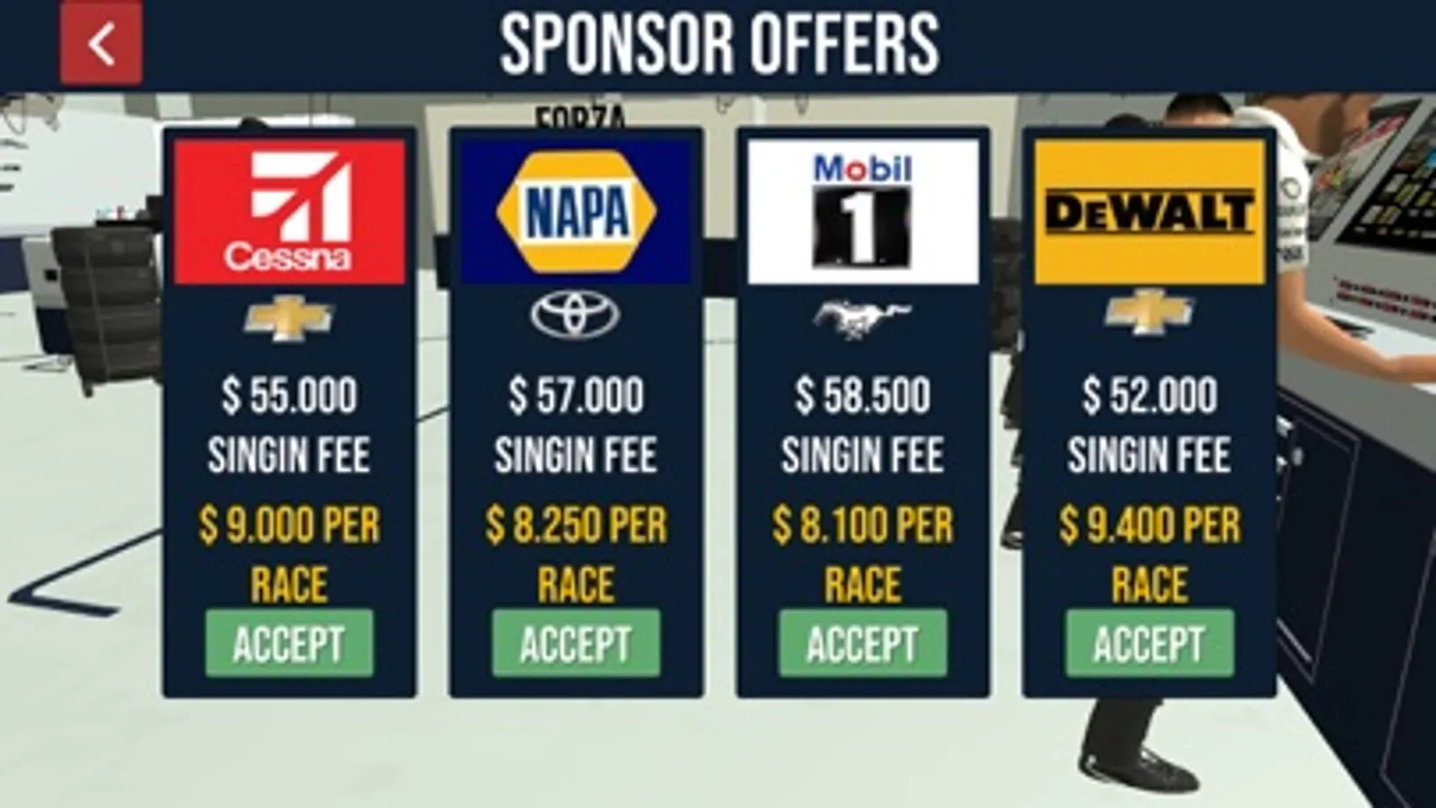 Find a Sponsor for your team and build up your stock car.