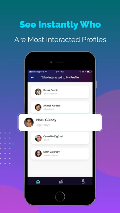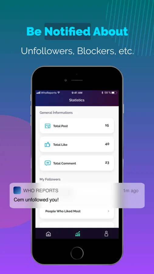 Get all analytics and statistics of your Instagram profile with Who Reports. Be notified about your blockers, unfollowers, etc. Make your profile as greatest!