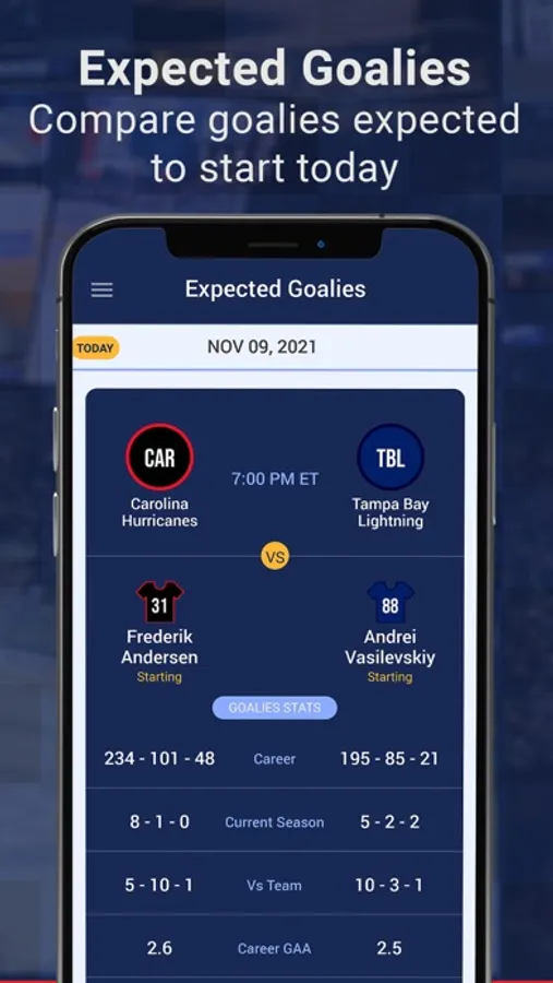 Unlike most NHL scores and alerts apps, here you can find out which NHL goalies are projected to start the game and their extensive set of stats that shows not only how their season is going but stats vs the team they’re playing against.