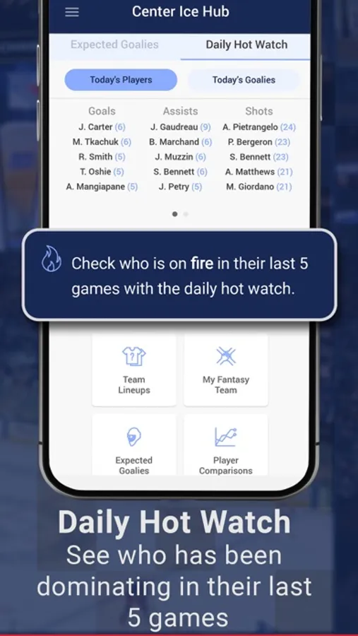 Center Ice Hub brings you today’s NHL matches, stats comparisons of goalies and players, hockey league teams updated lines, players on a hot streak, or even the ability to build your dream team to show your friends you're the best armchair GM.