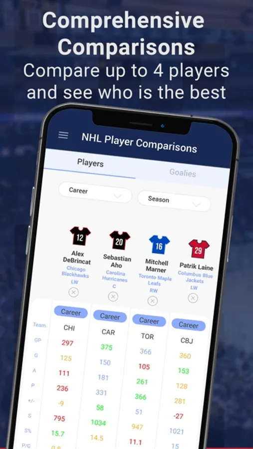 You can compare side by side NHL statistics of the 4 players of your choice. Is your friend convinced an NHL player is better than the other? Help prove them right or wrong with our comparison tool!