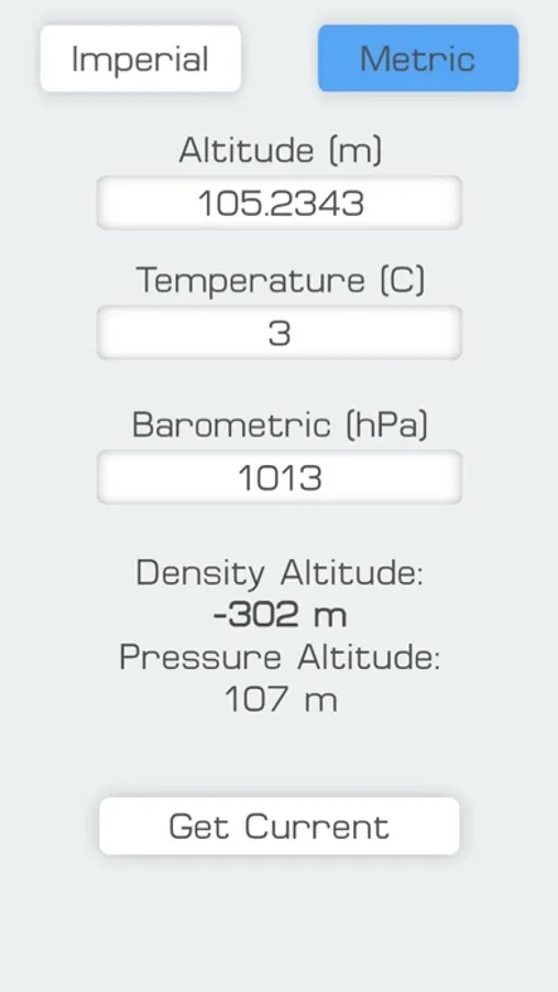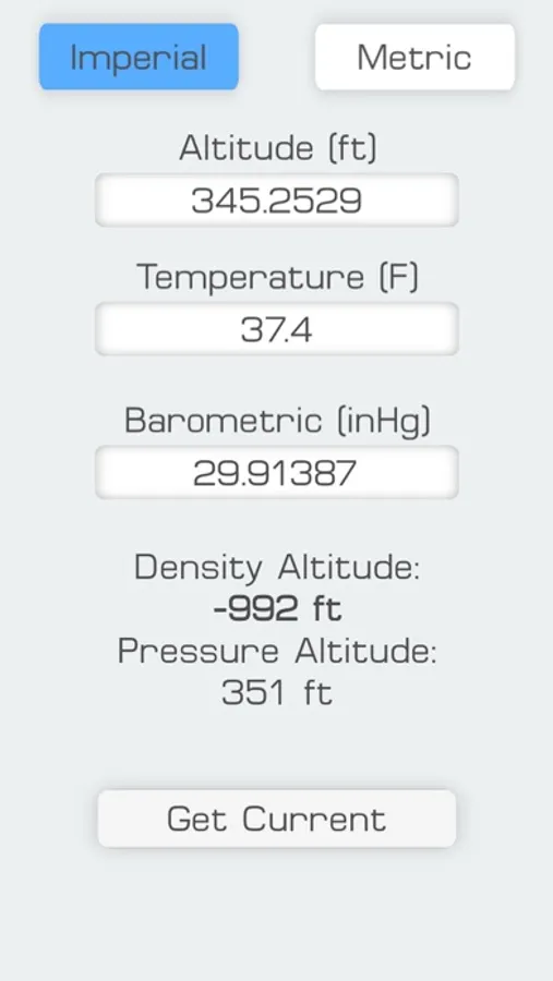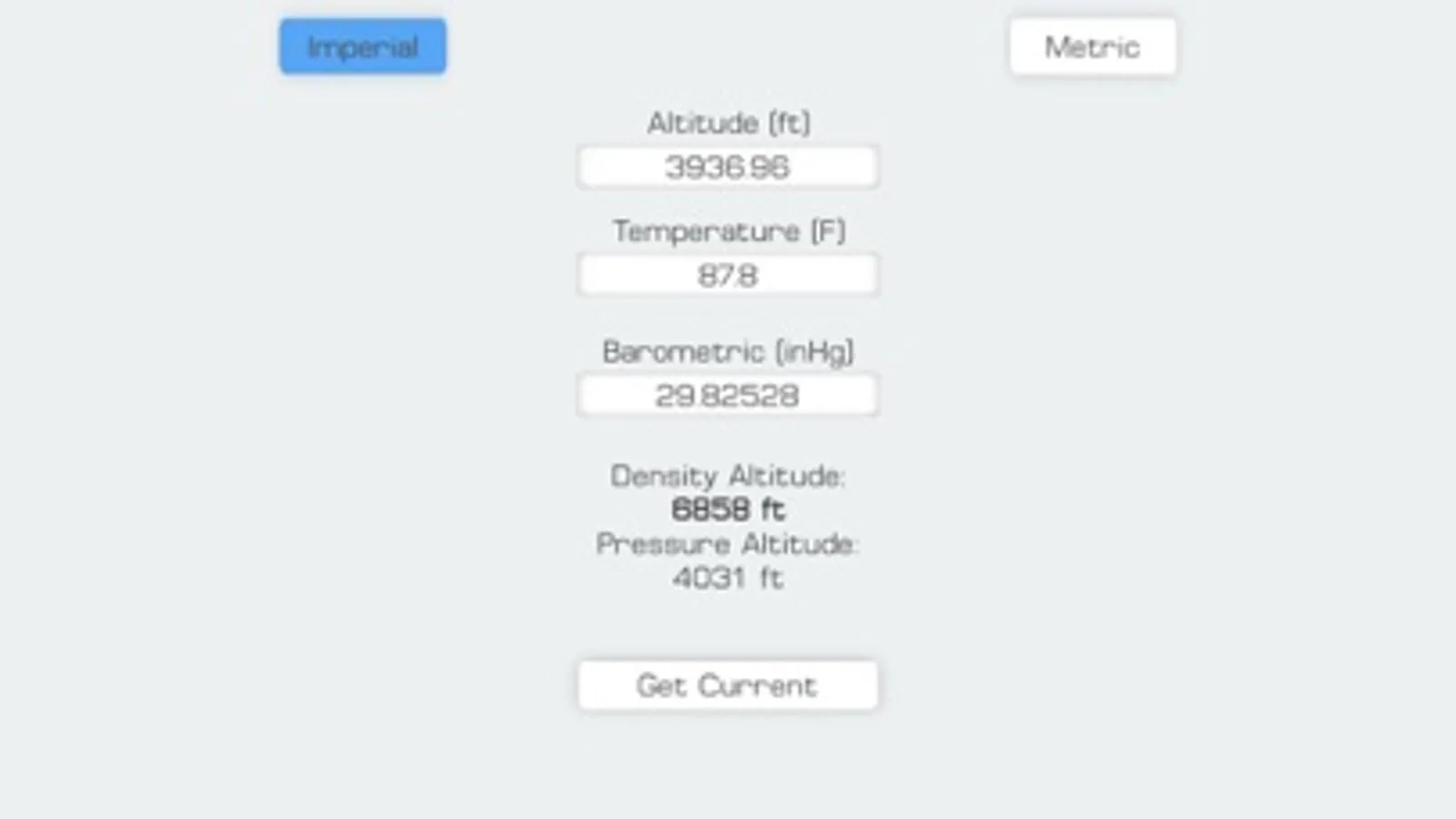 If you wish to calculate Density Altitude or Pressure Altitude from non-current data, you can fill in the desired values and calculate from custom altitude, ambient temperature, and barometric pressure.