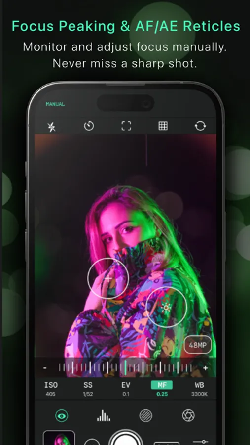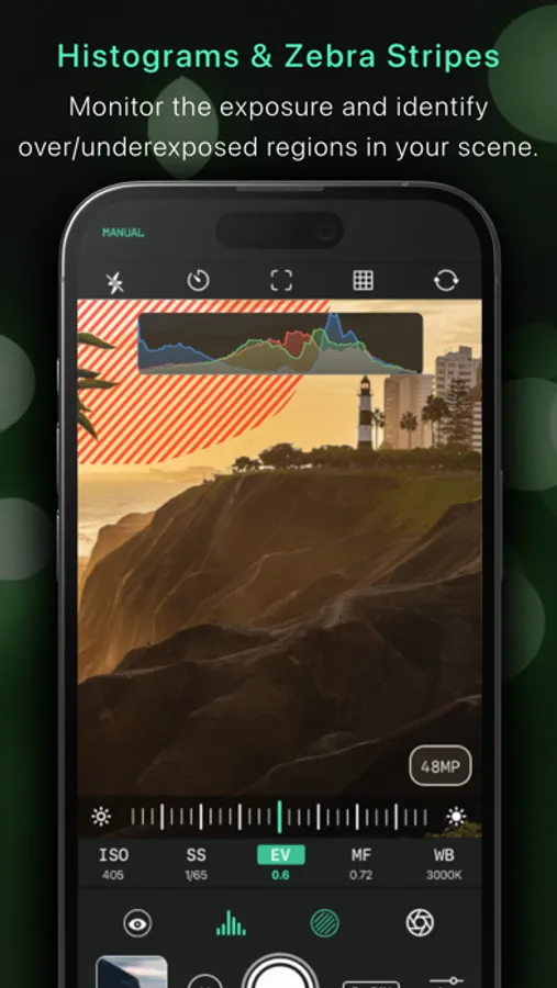 Reeflex offers two main capture modes - the main one for classic still photography and the Slow Shutter modes for long exposure photography - together with a rich set of professional tools for full manual control over focus, exposure, and white balance. The live histograms combined with the zebra stripes allow you to precisely monitor your exposure. The focus peaking is a powerful guide for adjusting the focus on your subject. By a simple two-finger tap on the viewfinder, Reeflex also allows you to independently adjust focus and exposure, moving two reticles across the scene.