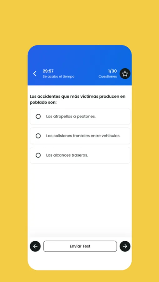 2) Simulación de examen: sí, es difícil estar delante del Test DGT, así que ahora podrás practicar y contestar a todas las preguntas en un tiempo limitado. Habrá un cronómetro en cuanto empieces el examen teórico, para que consigas experiencia y puedas sacarte tu permiso B fácilmente.