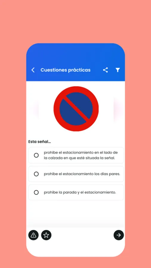 1) Preguntas de práctica: si se te suele olvidar con facilidad lo que aprendes, nuestra app te hará preguntas aleatorias de cualquier módulo del temario oficial de 2021, para que así practiques y no se te vuelvan a olvidar cuando estés delante del Test DGT.