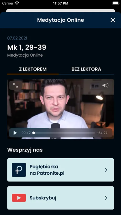 Medytacje prowadzi Daniel Wojda. Sam decydujesz, czy wolisz, aby w medytacji towarzyszył Ci prowadzący, czy chcesz wyłączyć opcję lektora i modlić się samemu. Proponowane medytacje są ściśle związane z praktyką uważności, dzięki czemu posiądziesz także tę umiejętność.