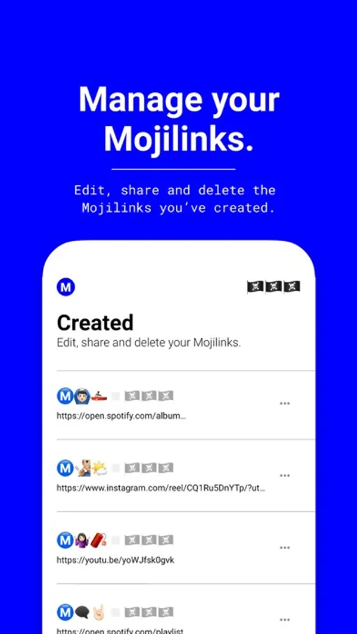 Here you can manage all Mojilinks you have created. Edit the target URL, share a Mojilink with your friends or delete it if you don't need it anymore.