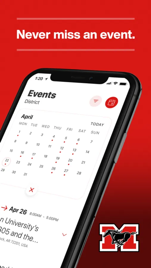The event section shows a list of events throughout the district. Users can add an event to your calendar to share the event with friends and family with one tap.