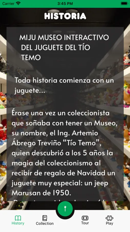 Dentro de la APP MIJU, podrás vivir una experiencia única con el Tour Virtual 360 del Museo MIJU del Tío Temo, donde descubrirás un universo lúdico conformado por seis salas en las que disfrutarás de más de 800 juguetes cuidadosamente seleccionados.