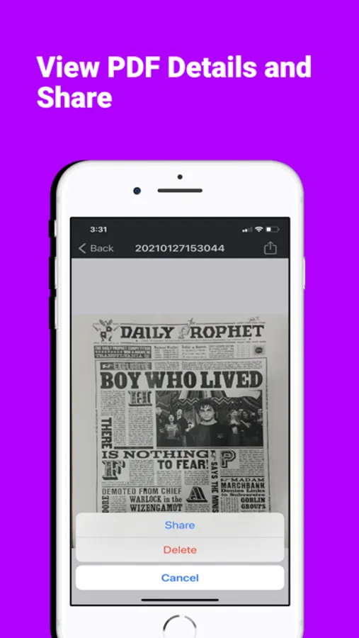 Tap each cell to view the detail of the PDF file and you can choose "Share" option to share and save the files.