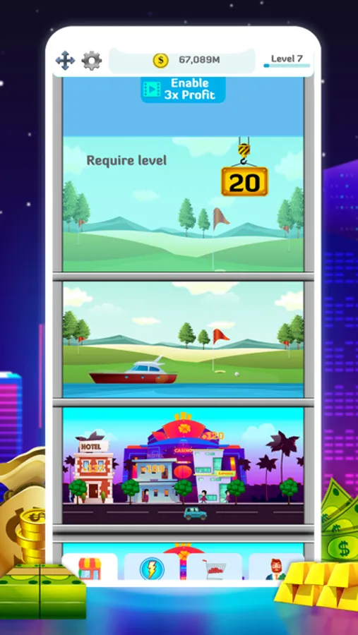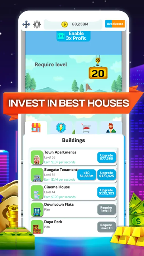Build the city of your dreams! Hundreds of buildings, different characters, you will find unlimited fun all in one. Build it in your own way and rule the world. Tap to adventure! Merge, develop and build a huge city with different attractive places to visit. Tap to develop and make a bunch of money. Purchase buildings, upgrade them, and merge them into mansions and enjoy watching your money grow and grow. Level up, complete targets, make your purchases more to earn more and more profit. City Building Tycoon: Ultimate idle clicker is the best game for idle building game lovers. Invest more to earn more.