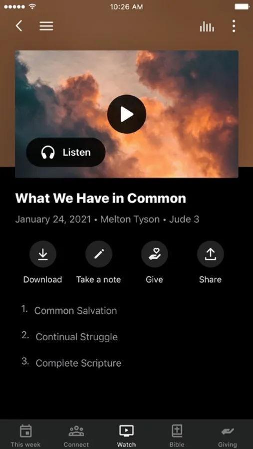 This app will help you stay connected with the day-to-day life of our church. With this app you can: watch or listen to past messages; stay up to date with push notifications; share your favorite messages via Twitter, Facebook, or email; and download messages for offline listening.