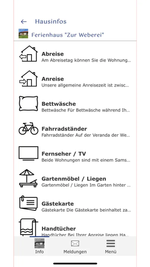 In dieser App finden Sie nützliche Tipps und Infos zu Ihrem Aufenthalt in der "Weberei" in Bad Tölz. Negben Hausinfos gibt es auch Tipps für Ausflüge, Sportmöglichkeiten, Restaurantempfehlungen u.v.m.