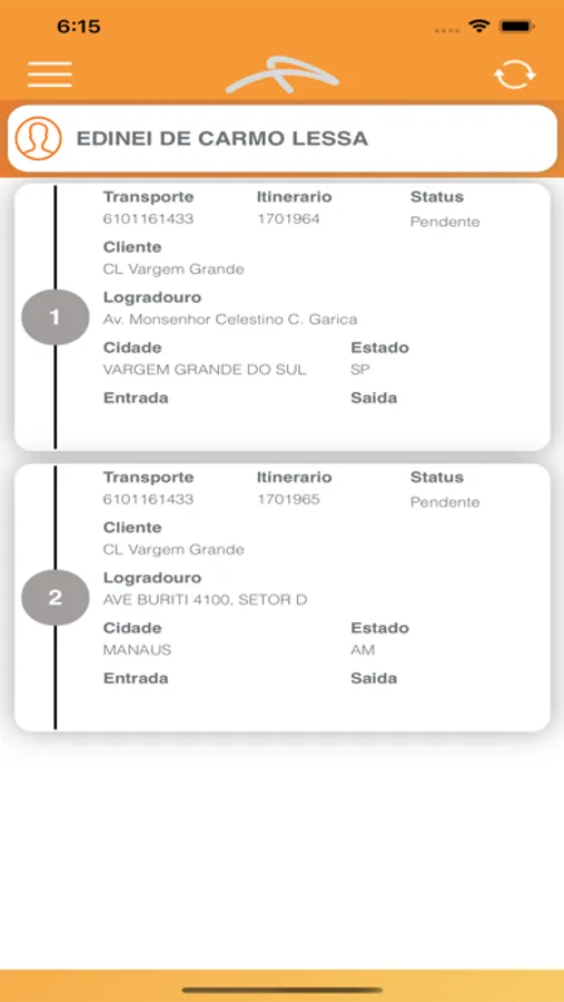 -Tela de entregas onde fica todas as entregas que o motorista precisa fazer para fechar o transporte, quando o motorista clica sem cartão da primeira entrega ele tem a opção de iniciar o transporte ou gerar uma ocorrência, iniciar o transporte na tela de entregas o botão ficará verde, o motorista já pode seguir viagem ate o proximo destino, ao chegar no destino o motorista clica na entrega que conforme o endereço e inicia a entrega na tela de entrega o circulo com o número do transporte vai ficar azul sinalizando que ele inicial a entrega, para fechar a entrega ele deve clicar novamente no transporte que foi iniciado e se o tempo de entrada na entrega para o maior que 3 min ele vai para a tela de finalização do transporte onde ele vai tirar uma foto do canhoto de entrega e depois pode finalizar a entrega, na tela de entregas o botão ficará verde.
