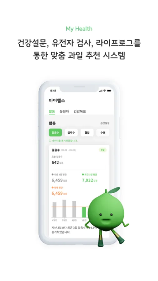 건강 설문, 유전자 검사 결과, 애플 건강 앱(Health App)에서 건강 데이터(걸음 수, 칼로리 소비량 등)를 연동하여 앱 내에서 간편하게 건강 상태를 파악하고, 맞춤 과일을 추천 받을 수 있는 서비스입니다.