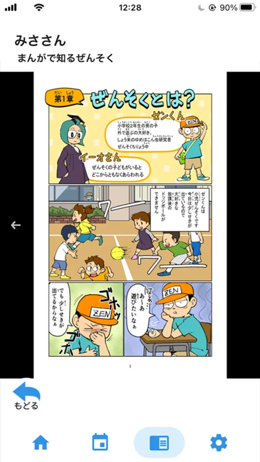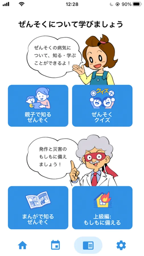 チャイルドアズマは、(1)服薬状況やコントロール症状に合わせたメッセージを含むぜんそく症状の管理機能、(2)マンガやクイズ方式で小児ぜんそくについて親子で理解を深める機能、(3)発作が起きた時や災害時などのもしもに備えるための知識や実践を学ぶ機能の3つを備えています。