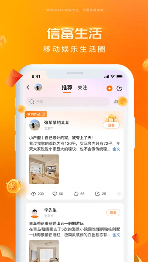 信富生活为用户提供一个独立、全面的移动生活圈,涵盖用户的衣、食、住、行,提供搜、聊、玩、乐、购全方位功能,真正实现移动生活圈概念。同时以“信用监测”和“评价体系”为目标,构建了一个以民生为核心,将政府事务、信用监管、和经济发展为一体的移动APP。